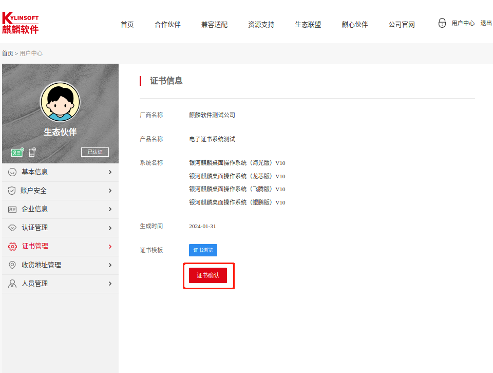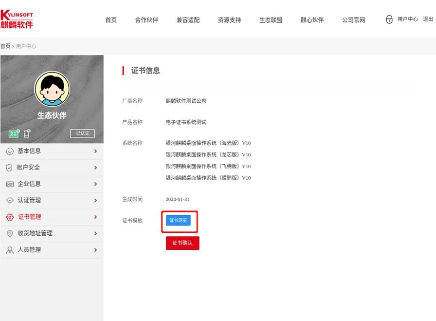 证书样式确认无误后,生态伙伴点击【证书确认】按钮,即可完成证书内容的确认。生态伙伴再次查看证书记录即可获得带有“麒麟软件生态适配专用章”的证书。若证书信息不准确,可联系生态对接人修订。