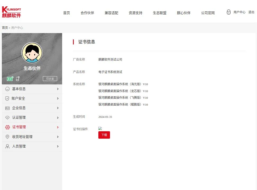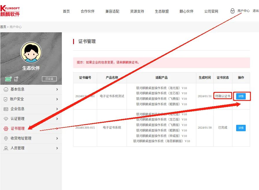 生态伙伴进入【麒麟软件官网】——【生态适配】——【用户中心】——【证书管理】,找到对应的证书记录,点击详情可查看证书格式与内容信息。