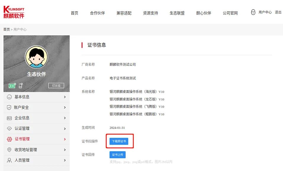 合作伙伴进入【用户中心】——【证书管理】,点击“待上传”状态证书右侧的“详情” ,点击“证书下载”,即可将电子证书下载到本地。