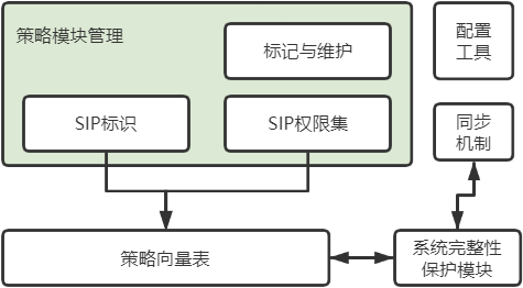 系统完整性保护模块是采用核内外安全一体化设计,遵守机制与策略分离原则,基于应用标记将系统基础资源进行分类分层划分,通过对系统资源访问权限管控,从而实现对系统资源完整性保护。其主要由内核系统完整性保护模块、内核策略向量表、策略管理模块、标记同步机制、系统初始化模块等组件组成。(如图1所示)