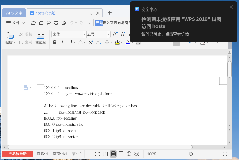 在我们实际操作中,若使用WPS文档编辑系统配置文件host,系统则会阻止该操作并提供消息通知。(如图2所示)