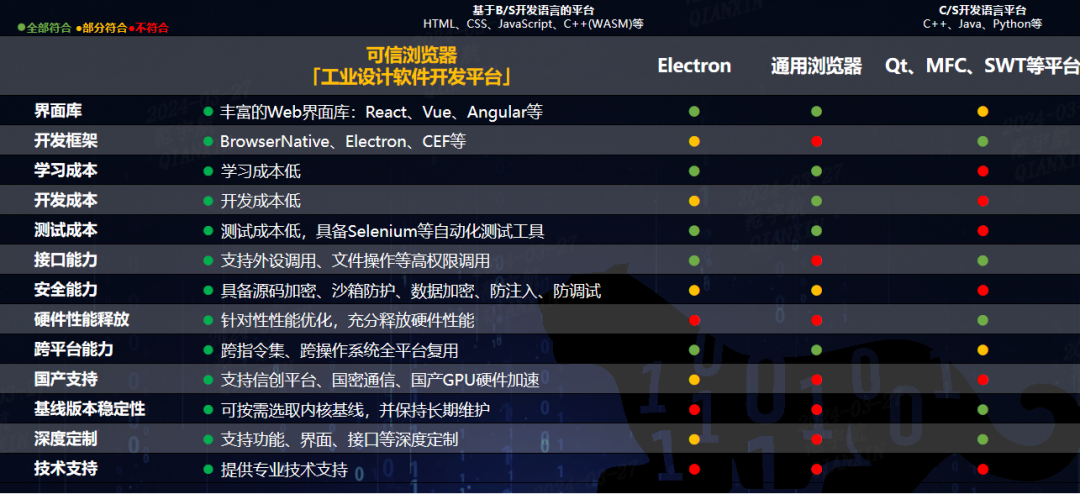 开发平台与通用浏览器和其他B/S开发平台相比,在开发框架支持度、硬件性能释放、国产平台支持等方面展现出显著优势。