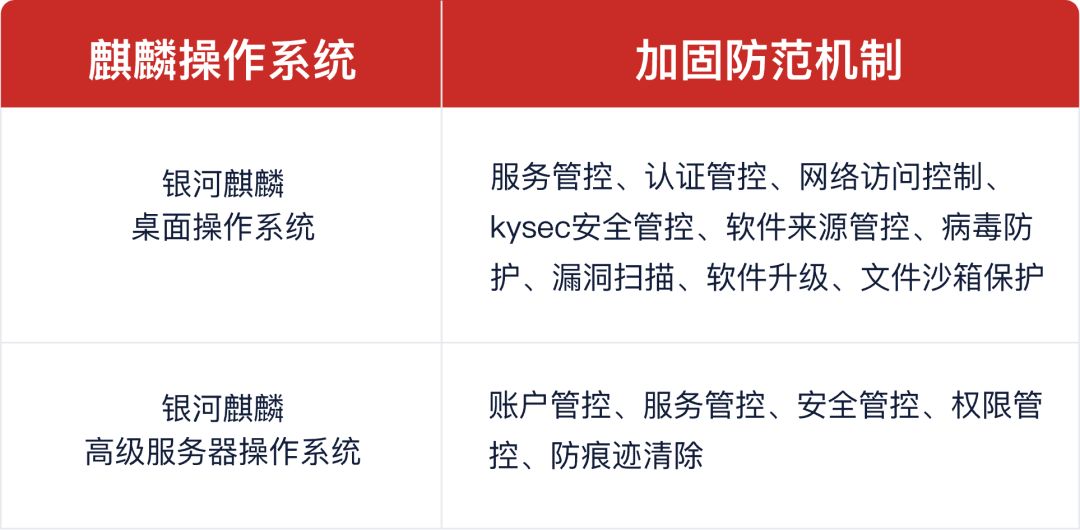 银河麒麟桌面操作系统针对勒索病毒提供了服务管控、认证管控、网络访问控制、kysec安全管控、软件来源管控、病毒防护、漏洞扫描、软件升级、文件沙箱保护等方面的加固防范机制。银河麒麟高级服务器操作系统针对勒索病毒提供了账户管控、服务管控、安全管控、权限管控、防痕迹清除等方面的安全加固防范机制。以上每个方面的安全加固都可以有效遏制或者追踪病毒的入侵与破坏,通过麒麟操作系统纵深防御确保用户的数据安全。