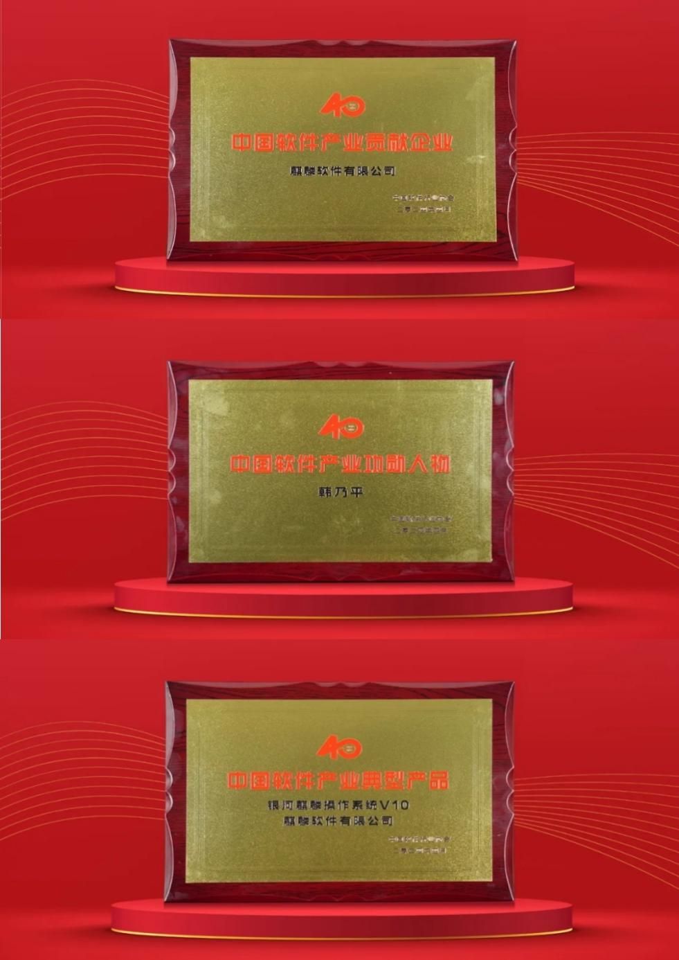 此外,凭借坚实的技术实力和创新能力,麒麟软件荣获“中国软件产业40年贡献企业”、银河麒麟操作系统V10荣获“中国软件产业40年典型产品”两项大奖。