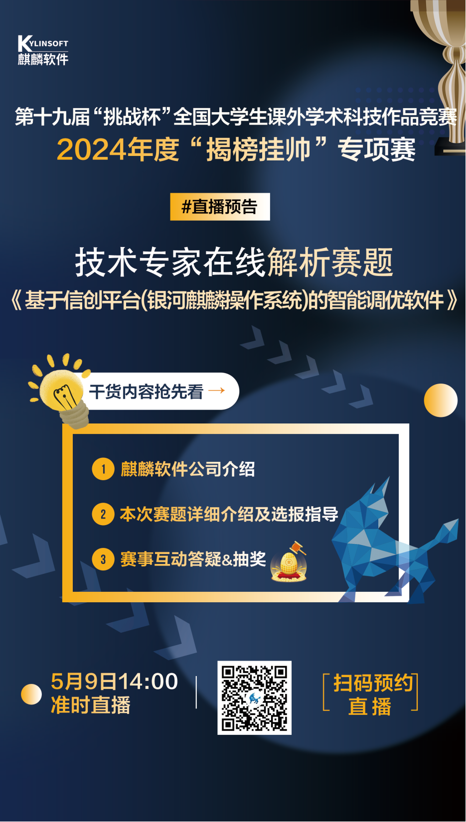 为了帮助大家更好地了解比赛规则、赛程安排,以及赛题具体要求,麒麟软件特别邀请到了本次赛题出题专家,在5月9日(本周四)下午两点银河麒麟操作系统视频号直播间,现场为您答疑解惑!