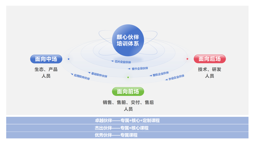 为帮助麒心伙伴紧跟网信市场发展态势、提升各方人员能力、增强综合竞争力,麒麟软件为麒心伙伴制定了专属赋能培训体系。这其中有面向前场销售和售前人员开展的麒麟软件主流在售产品相关课程,和面向后场技术服务、售后、项目交付人员开展的麒麟软件桌面和服务器操作系统相关产品的安装、交付、运维、常见故障排查相关课程,以及面向中场生态适配相关人员的适配工具、技术等相关方面的课程。