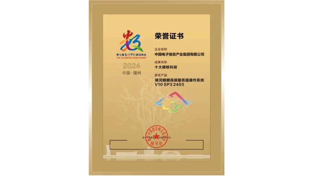 5月25日,2024第七届数字中国峰会最佳成果颁奖仪式举行,相关领域专家从180家单位选送的技术领先、创新性强,推动核心技术、关键基础技术创新应用的594个成果中,经过三轮严格遴选,评选出“十大硬核科技”等成果。银河麒麟高级服务器操作系统V10 SP3 2403作为唯一国产操作系统产品入选!