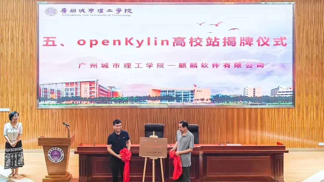 在双方的共同见证下,魏德敏与李滨正式签署了校企框架合作协议,广州城市理工学院计算机工程学院院长奚建清与麒麟软件华南事业部副总经理朱毅共同为“openKylin高校站”正式揭牌,广州城市理工学院与麒麟软件在人才培养、科研合作、实训基地建设等方面将展开深度合作,双方将结合各自的优势资源,共同打造产学研一体化平台,为学生提供更多的实践机会和职业发展平台。