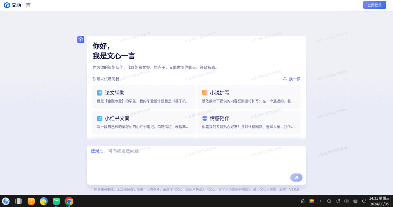 文心一言是百度全新一代知识增强大语言模型,能够与人对话互动、回答问题、协助创作,高效便捷地帮助人们获取信息、知识和灵感。文心一言具备理解、生成、逻辑、记忆四大基础能力,能够轻松处理各类复杂任务,在工作提效、学习成长、生活助手、休闲娱乐、情感陪伴等多个场景都是你的好帮手。