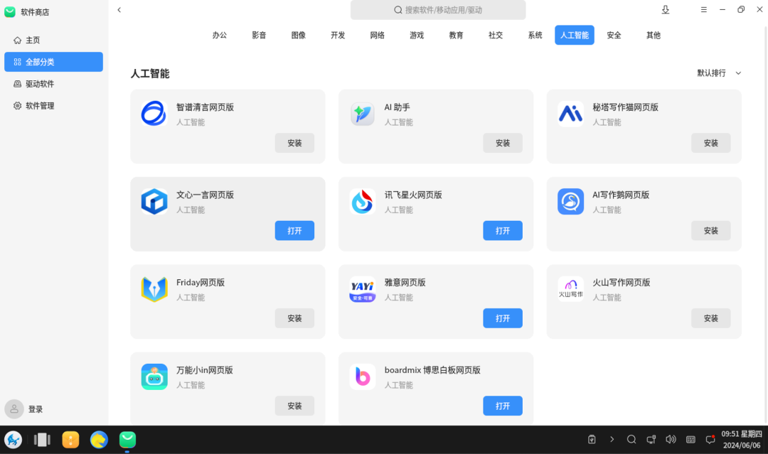 AI应用工具快速崛起,麒麟软件紧跟用户需求,将AI应用列为生态建设重点。近日,麒麟软件商店上线全新板块“人工智能”,囊括了文心一言、讯飞星火、博思云创、雅意等AI应用工具,用户可一键下载、安装使用,快速开启AI智能体验!