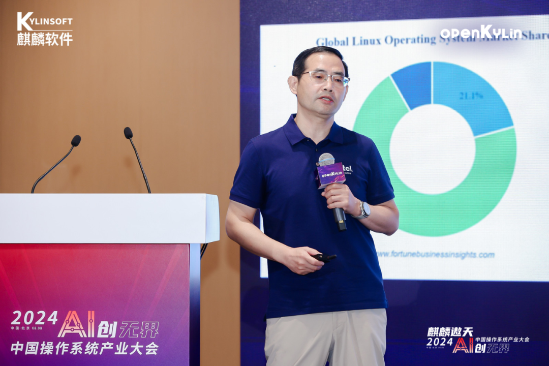 英特尔(中国)有限公司开源技术总监杨继国带来《AI时代PC操作系统新机遇》主题分享。他表示,AI为Linux桌面带来前所未有的新机遇。英特尔正积极投身于这一变革浪潮,构建了CPU、GPU和NPU的AI加速架构——英特尔酷睿Ultra处理器,并优化了AI软件的能耗效率,从而在生产力、创造力和安全性方面提供全新的AI体验。英特尔加入openKylin社区后,成立了Intel SIG与社区开展深入合作,率先完成了openKylin 2.0版本与英特尔最新14代Meteor Lake平台的适配,共同构建AI PC上层AI生态系统。