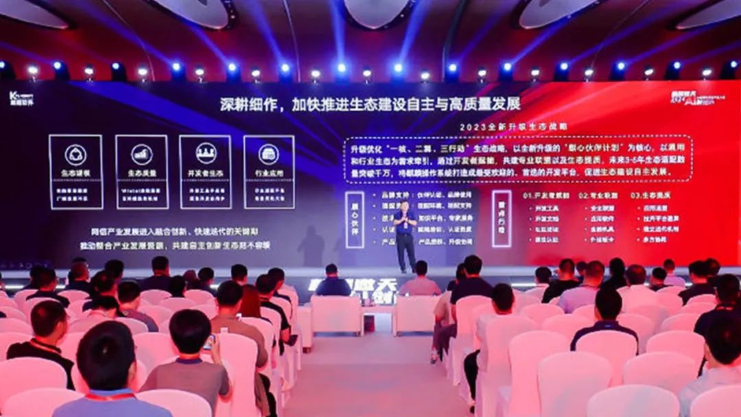 2023年,麒麟软件发布“一核、两翼、三行动”生态发展战略,即以“麒心伙伴”计划为核心,以通用生态、行业生态需求为牵引,通过培育开发者生态、共建专业生态联盟、软件生态提质三项行动。一年以来,在生态伙伴的支持下,麒麟软件“一核、两翼”硕果初成,“三行动”持续发力。