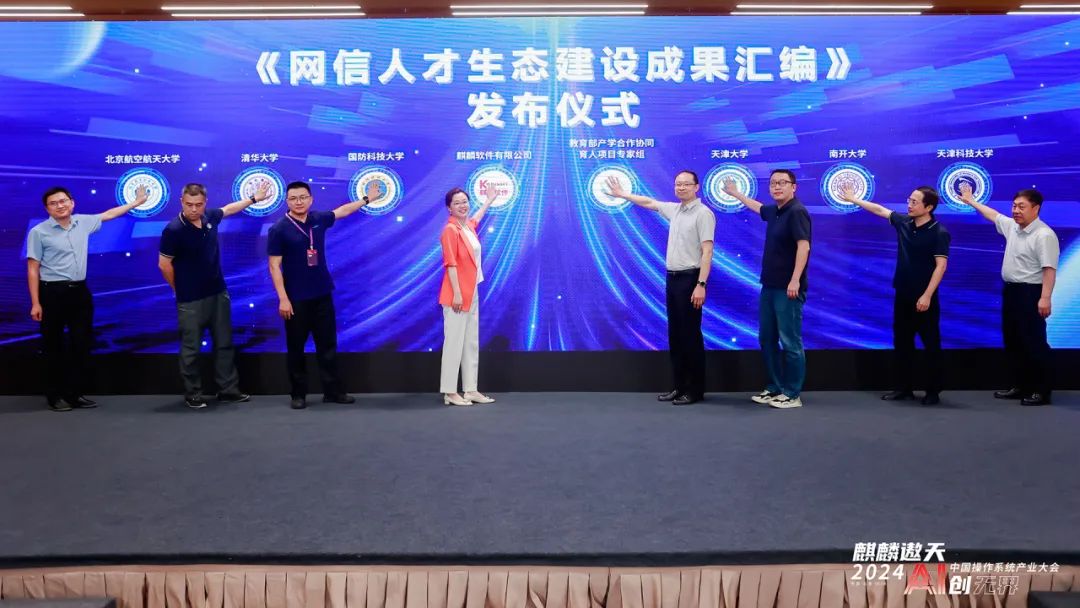 本次盛会上,麒麟软件携手教育部产学合作协同育人项目专家组、国防科技大学、清华大学、北京航空航天大学、天津大学、南开大学、天津科技大学等高校代表,共同发布了《网信人才生态建设成果汇编》(以下简称《汇编》)。教育部产学合作协同育人项目专家组办公室主任时阳介绍了《汇编》的主要内容。从政策引领到平台搭建,从产教深度融合到教育信息化发展,《汇编》汇聚了近年来麒麟软件与政产学研用各界携手在网信人才生态建设方面的创新举措与显著成效,提供了可借鉴的参考依据和实践指南。