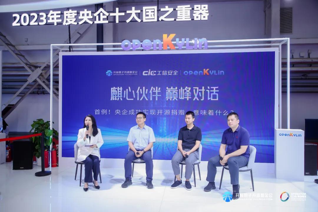国家工业信息安全发展研究中心软件所副所长辛晓华(左二)、开放原子开源基金会业务发展部高级顾问李扬(左三)、openKylin社区理事长、麒麟软件副总经理朱晨(右一)参与直播访谈