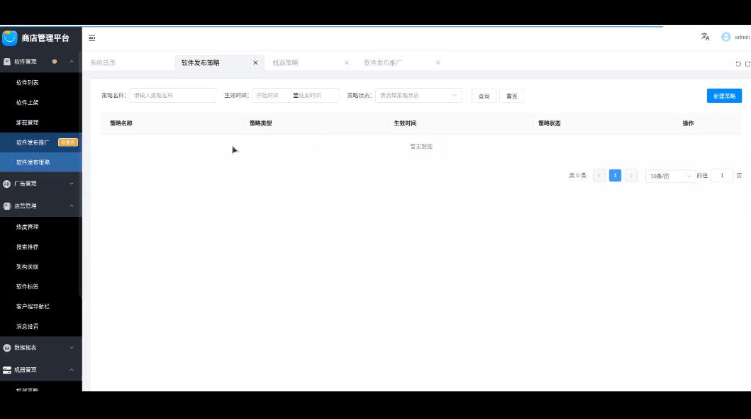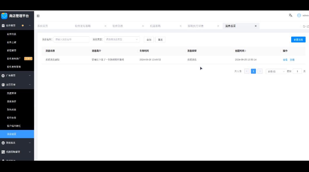 软件商店V2.6增加了“策略”、“消息通知”功能,管理员可以通过这两个模块给指定终端下发安装/卸载/不允许安装策略以及发送消息通知。