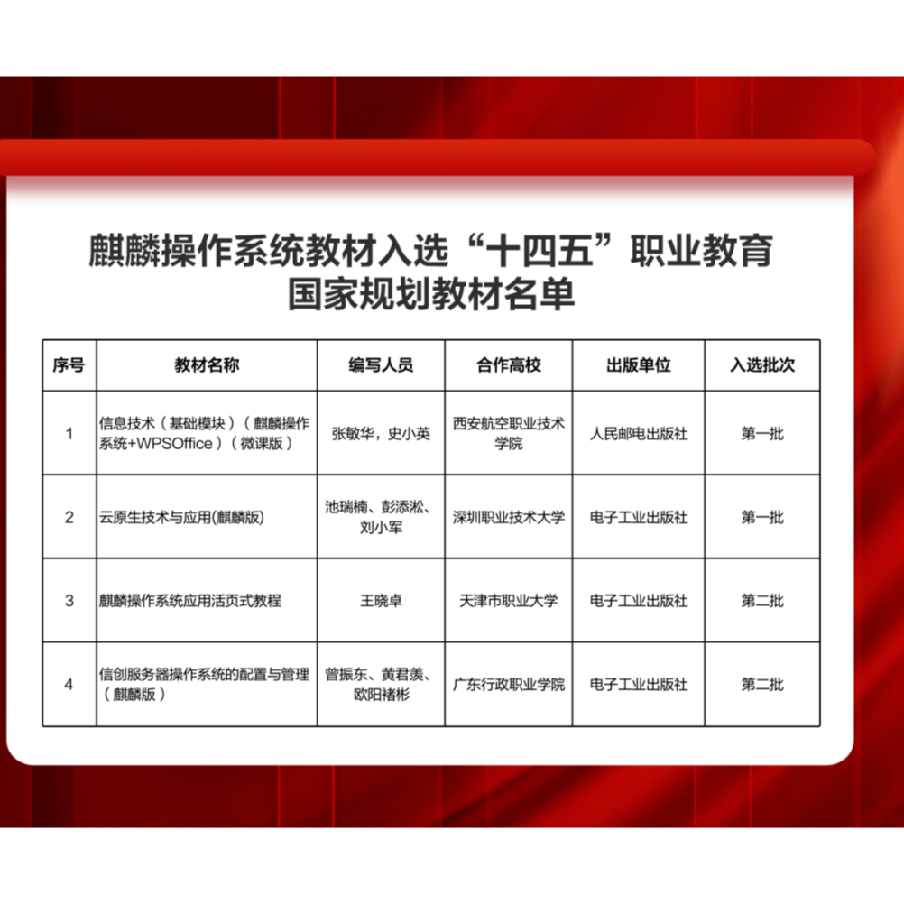 教育部正式公布第二批“十四五”职业教育国家规划教材遴选结果。麒麟软件选送的两本教材凭借扎实的教学实践基础、先进的课程设计理念以及对信创产业发展的深刻把握,成功入选!截至目前,已有四本麒麟操作系统教材被纳入“十四五”国规教材名录。