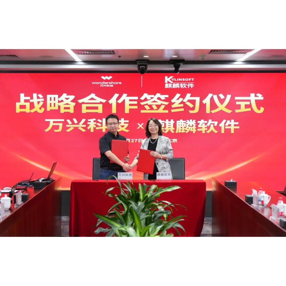 2025年8月27日,万兴科技与麒麟软件在京举行战略合作签约仪式。万兴科技线下营销中心总经理唐芳鑫、麒麟软件生态合作部总经理姚翎作为双方代表签署战略合作协议。