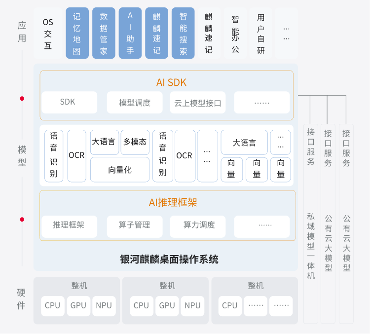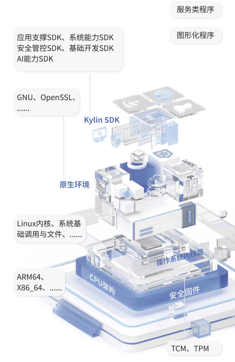 系统将应用层、基础层相关接口和系统层接口进行封装,并增加 AI 能力 SDK,为开发人员提供统一便捷的调用方式,构建适用于银河麒麟桌面(教育版)V10 的原生应用,推动应用的智能化改造与创新。