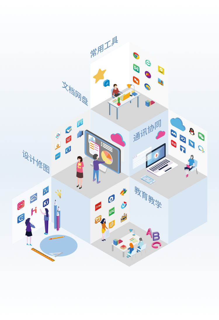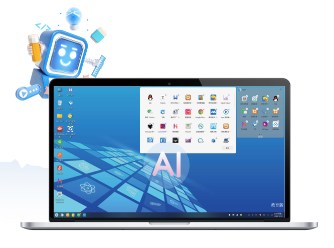 • 其大幅优化桌面空间,提供简洁流畅的系统环境和丰富易用的应用软件,满足“教、学、管、考、评”等场景需求;