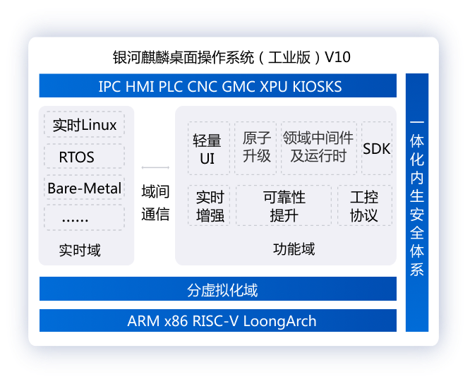 银河麒麟桌面操作系统(工业版)V10是面向工业控制、数采、显示等场景的桌面操作系统产品,继承银河麒麟桌面操作系统V10通用领域版本能力及生态,具备轻量桌面、系统原子更新、高等级信息安全以及硬件多域隔离、操作系统混合部署能力,支持X86、ARM、RISC-V、LoongArch架构,可满足工业场景对桌面操作系统安全可信、实时可靠的需求。