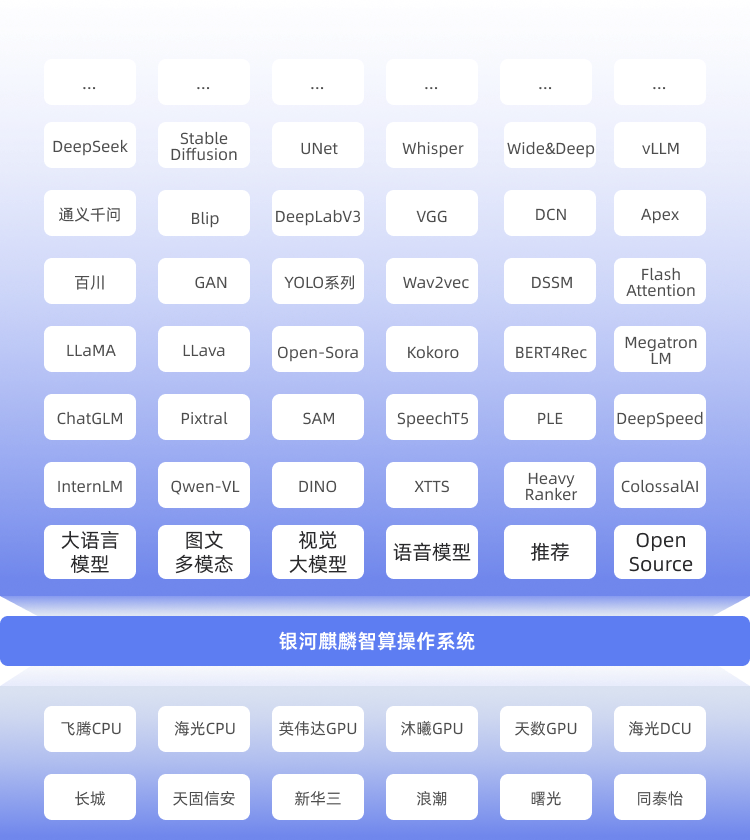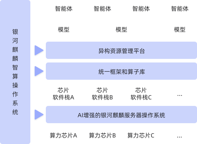 银河麒麟智算操作系统面向人工智能大模型训练与推理,通过兼容开放的架构实现对异构软硬件资源统一管理,提供统一的训练与推理框架,丰富的算子库和主流开发工具链支持,依托云化平台实现CPU/GPU/NPU等异构算力的智能调度与弹性扩展,为用户提供从模型开发到大规模部署的全流程支持,兼具安全创新、生态友好和能效优化特性,为AI产业化提供操作系统级基础支撑。