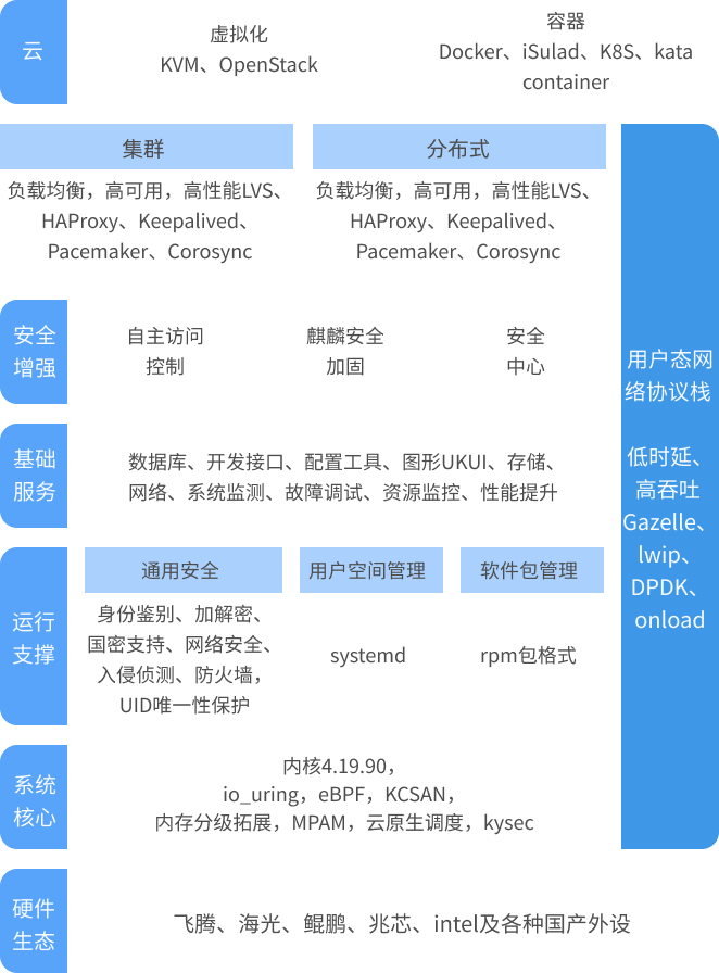 • 大量裁剪瘦身,针对性强化系统性能表现、安全能力、网络处理能力和虚拟化/容器支持能力等,充分满足金融场景的延时敏感诉求。