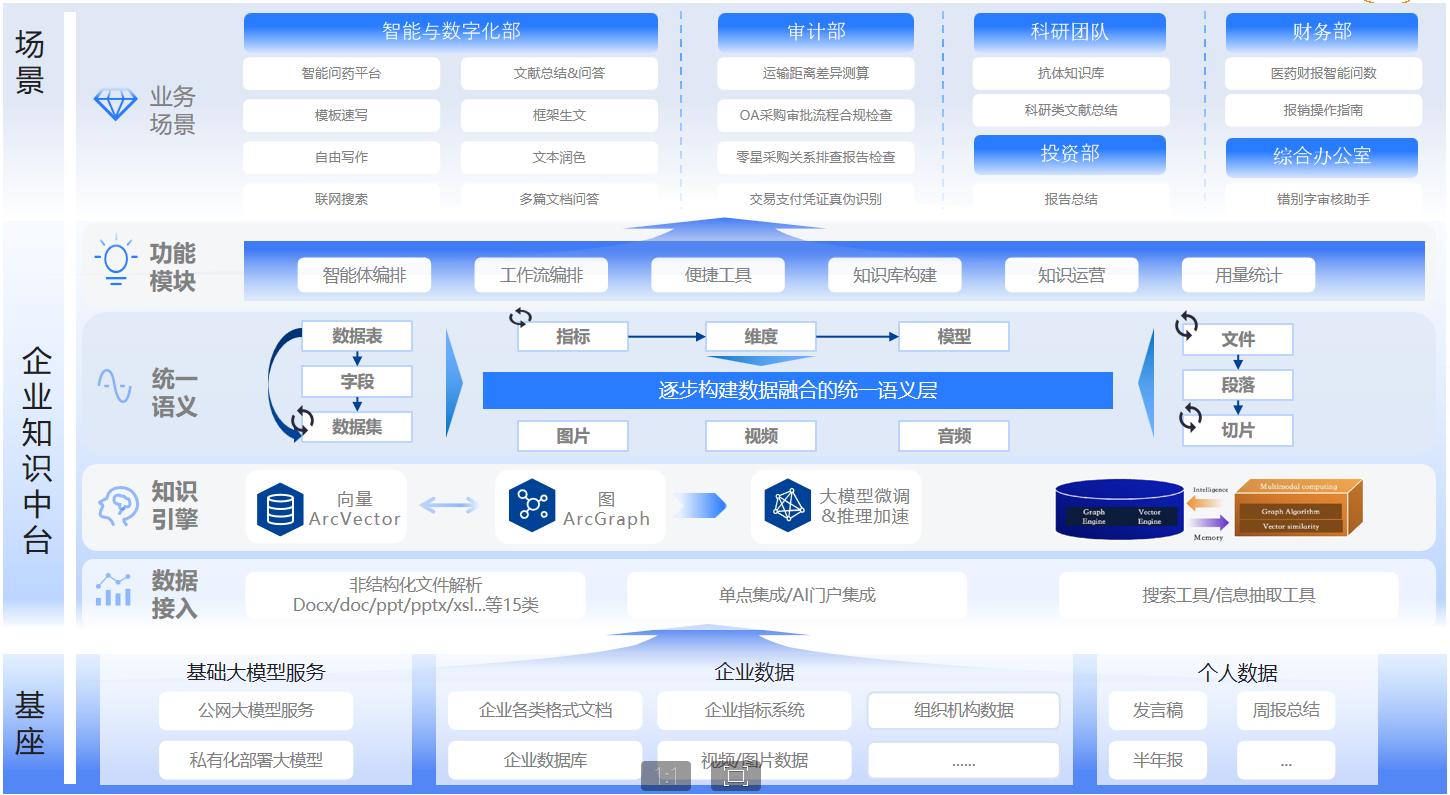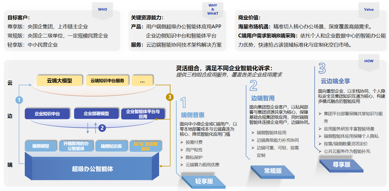 本方案以云边端协同智能体系为核心,结合端侧超级办公智能体 APP、企业边侧知识中台,分层适配智能办公写作、经营指标分析、公司规章问答、安全生产、采购合规、科研助手等不同智能场景。方案覆盖化工、制造、金融等行业,适配从基础办公到集团复杂协作的智能升级需求。