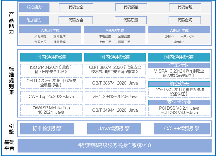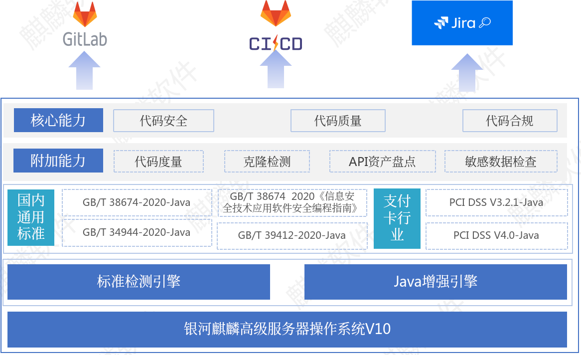 建设内容:该部门在国产化进程中,部署了基于银河麒麟高级服务器操作系统V10的智能化代码安全分析平台,在隔离网络环境下实现自动化代码审计、合规检查并与现有CI/CD流程无缝集成。