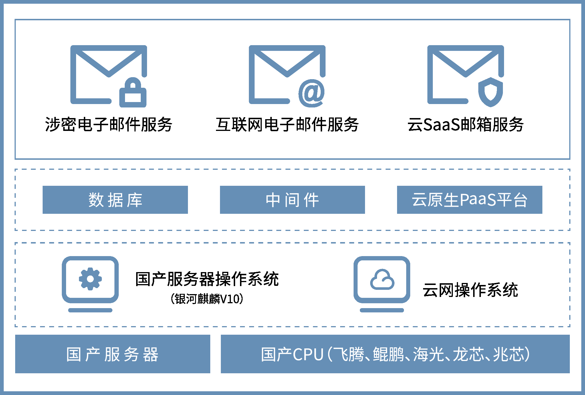 方案基于全栈国产化技术路线构建,以“安全优先、合规适配”为核心目标,从底层操作系统到上层应用实现全链路自主创新,为用户提供涉密电子邮件系统、互联网安全邮件系统、云SaaS安全邮箱,以及邮件安全网关、邮件归档系统等邮件工具,确保邮件身份可信、邮件内容可控,覆盖日常办公、信息传输、公务邮件、跨境传输等业务场景,支持邮箱数据平滑迁移,支持邮箱智能AI助手,满足差异化、场景化的邮件系统建设需求。