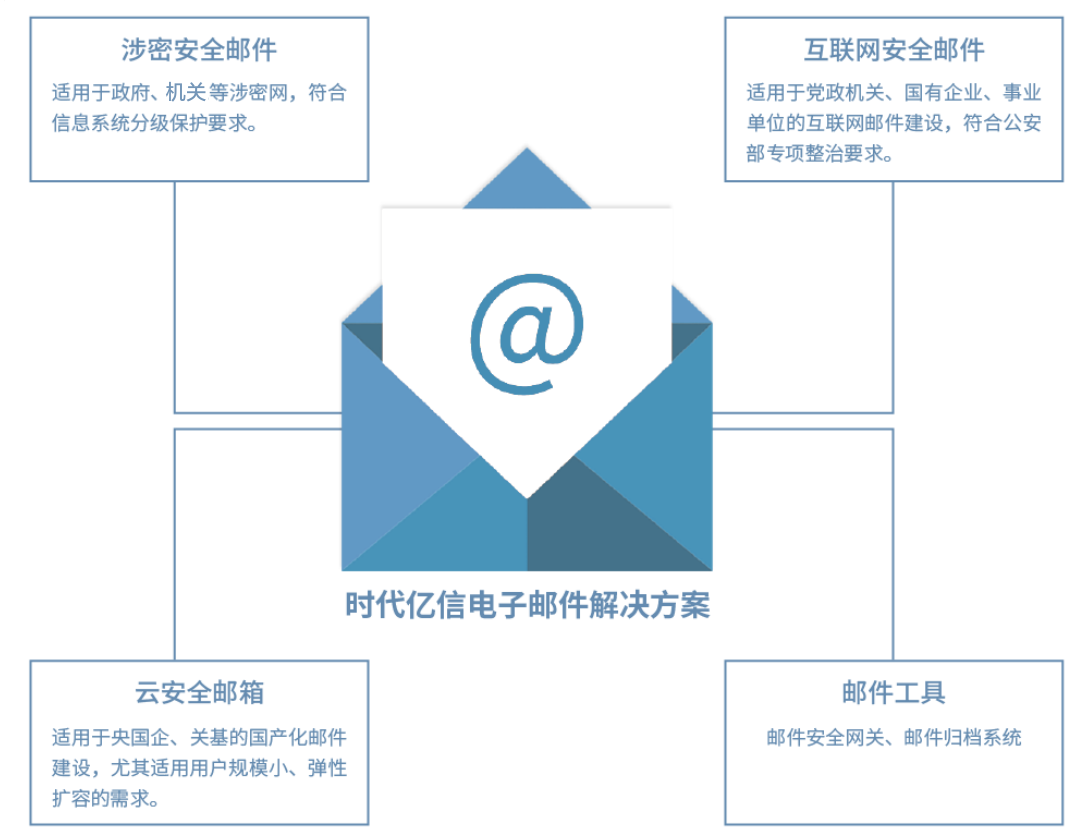 - 互联网安全电子邮件系统:面向党政机关、事业单位和央国企领域,采用国产密码算法,提供满足等保和密评要求的国产化安全邮件服务。