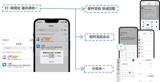 - 丰富的开放协同能力。具有丰富的标准 API 接口,可简单方便地与企业认证系统和各业务系统集成对接;与钉钉天然集成,实现邮件与钉钉的组织架构、通讯录、日历、钉盘、消息、音视频、Ding 等能力无缝集成。