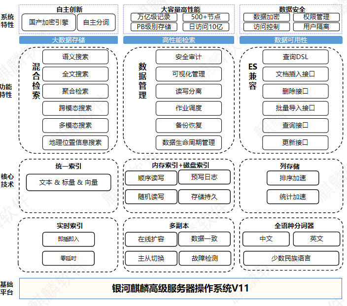 拓尔思基于银河麒麟操作系统的国产化搜索型数据库,针对全文与语义检索的双重要求,以“全文+向量”双引擎重构检索底 座,兼容ES的API接口,迁移成本降低,打破多系统割裂瓶颈,为企业国产化与AI应用落地提供降本增效的一站式解决方案。 同时,该产品引入索引分片、列存储及内存索引等前沿技术,叠加冷热分区、读写分离、多副本等企业级特性,可广泛服务于 政府及企事业单位、金融、媒体等大中型数据中心场景。