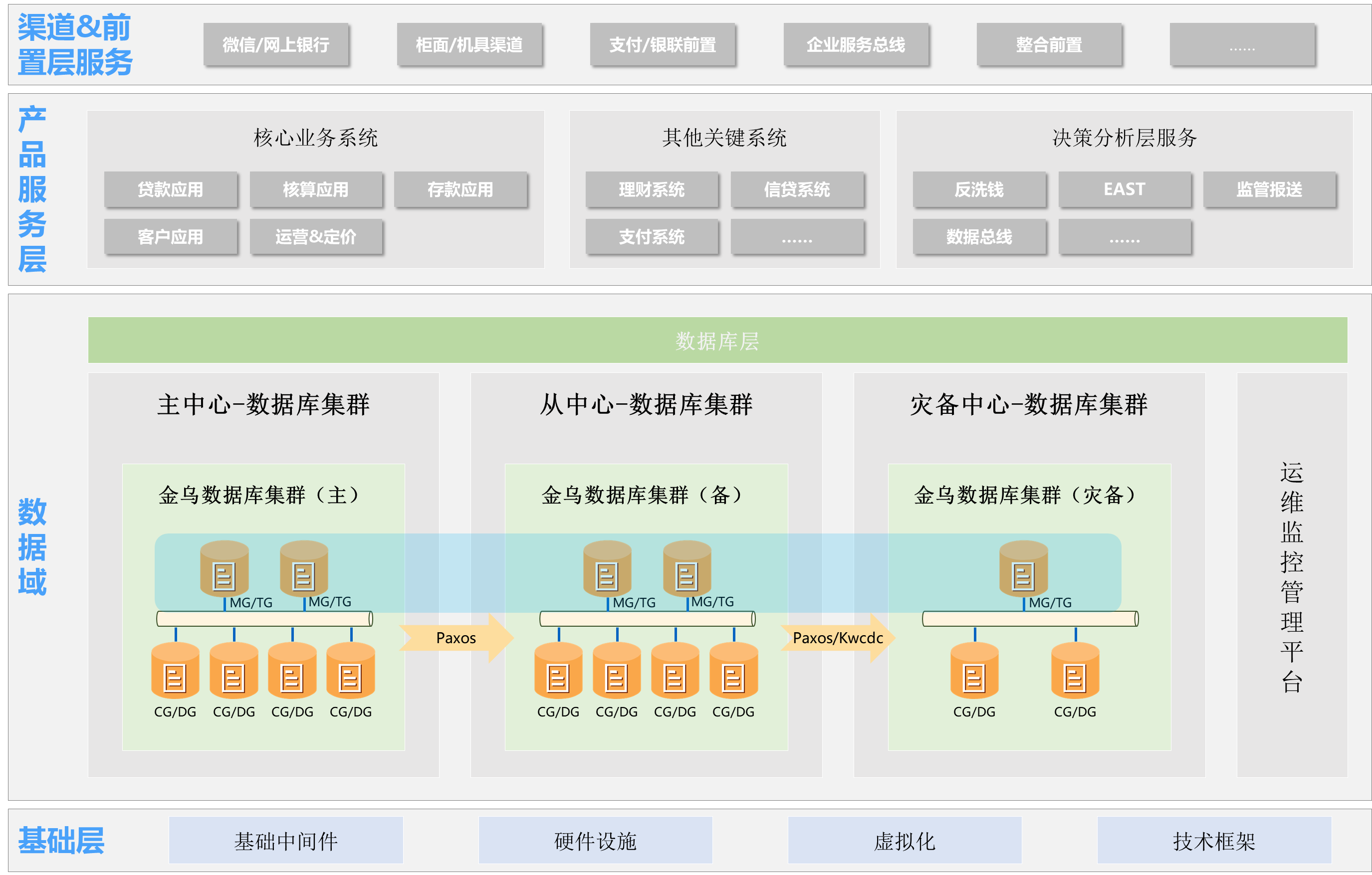 金乌数据库的两地三中心多活方案适用于银行核心交易、支付清算、账务处理等高可用要求场景,支持RPO=0、RTO<8秒的机房级容灾。在主机房故障时,可自动切换至同城备机房,保障7×24小时业务连续性;同时支持滚动灰度升级与国密算法,满足金融核心系统对强一致性、安全合规及自主创新的严苛要求。