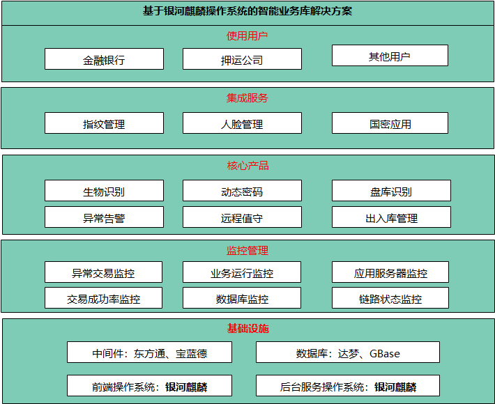 案例价值:该方案通过筹建基于银河麒麟操作系统及符合监管要求的智能四类业务库,辅以智能化管控手段,以期控制守押社会化带来的运营成本,提升银行网点综合竞争力,助力银行网点持续着力发展科技金融、绿色金融,充分发挥网点作为营销服务战斗堡垒的作用,持续提升网点价值创造能力和综合竞争力。