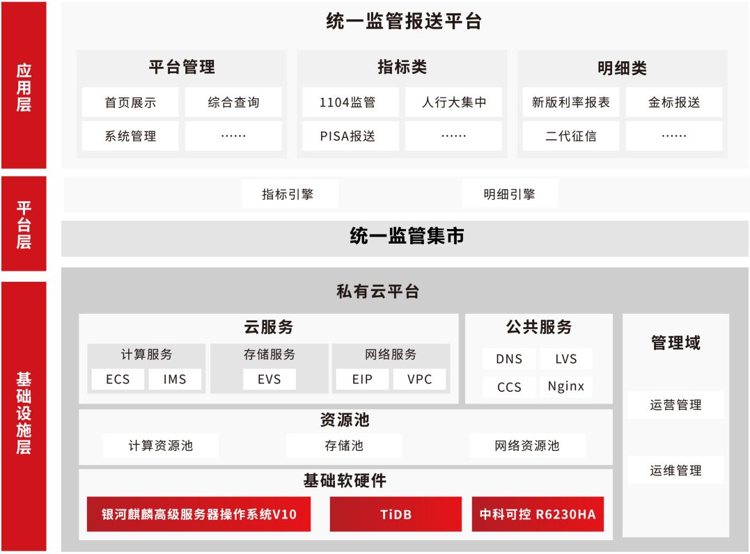 为保证金融稳定及防范行业风险,人民银行和银保监会需及时汇总各银行的情况并出台针对性的政策和措施,因此要求各类银行进行数据报送,目前银行业的监管报送主要包括1104、人行大集中、反洗钱报送、利率报备等近二十多种数据报送,该系统需满足监管报送范围大、上报接口众多、数据上报频率快、数据准确性高等要求,为保障银行金融数据准确、提高报送效率,宇信科技基于银河麒麟高级服务器操作系统V10,搭载统一监管报送系统,形成高安全高效率的监管报送系统联合解决方案。